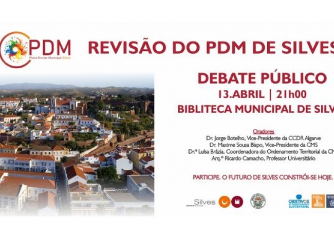 O Município de Silves, em colaboração com a Associação Grupo dos Amigos de Silves, vai realizar um debate público referente à revisão do Plano Diretor Municipal (PDM) de Silves, no próximo dia 13 de abril, pelas 21h00, na Biblioteca Municipal de Silves.