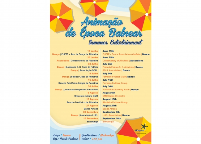 Este ano a abertura do Programa de Animação da Época Balnear acontece no dia 18 de junho com a atuação da FUETE – Associação de Dança de Albufeira que irá protagonizar um espetáculo cheio de ritmo, cor e alegria, com os alunos a mostrarem o que melhor sabem fazer nas disciplinas de Dança Clássica, Contemporânea e Sapateado.